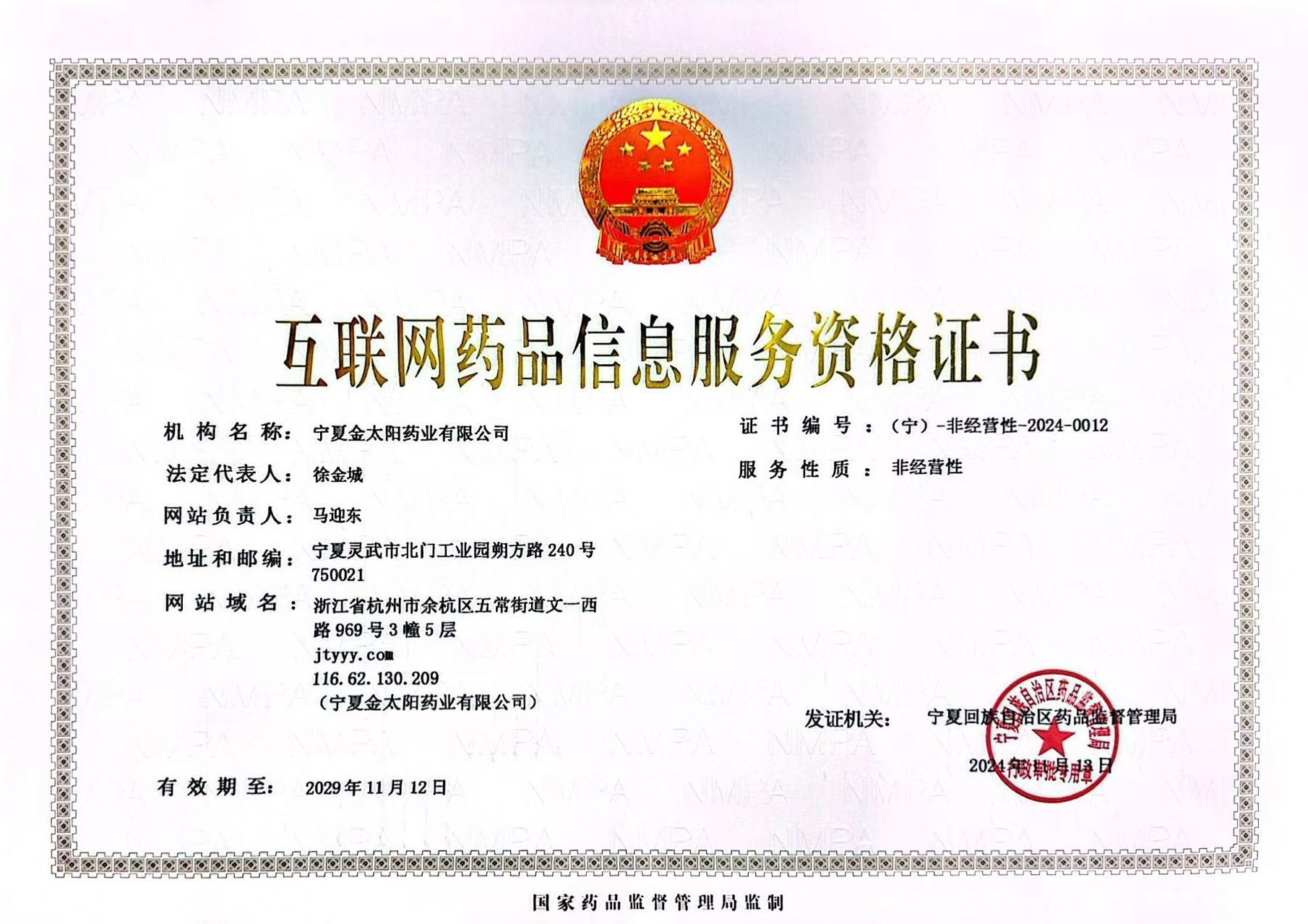 寧夏金太陽藥業有限公司 互聯網藥品信息服務資格證書 證書編號:(寧)-非經營性-2019-0005 …